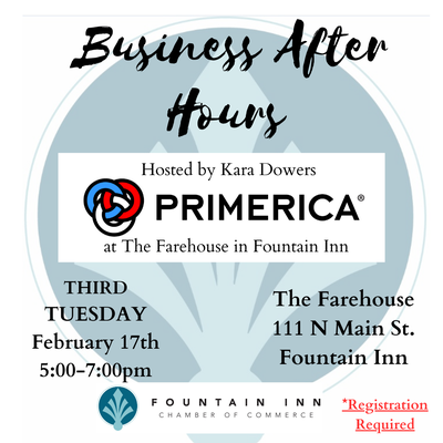 Kara Dowers of Primerica sponsors our Business After Hours at; The Farehouse 111 N Main St, Fountain Inn, SC 29644